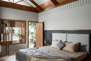 Each bedroom is uniquely designed to offer serenity and comfort while maintaining a sophisticated aesthetic. The first bedroom features muted grays and beiges, a plush headboard, patterned tile detailing, and brass table lamps, creating a soothing retreat. The second bedroom is defined by its striking vaulted wooden ceiling, soft gray walls, and a cozy reading nook, exuding warmth and tranquility. The third bedroom showcases a tufted gray headboard, layered textures, and a vertically striped wooden wardrobe. A sleek writing desk with a green glass pad adds both style and functionality. The fourth bedroom boasts a caramel-colored channel-tufted headboard against a textured gray wall, framed artworks, and gold-toned lighting. A luxurious band of marble with gold trim enhances the space’s elegance. The fifth bedroom focuses on textures and subtle patterns, with a wooden headboard featuring colorful inlays, neutral-toned bedding, soft green quilts, and elegant window treatments that complete the serene ambiance.